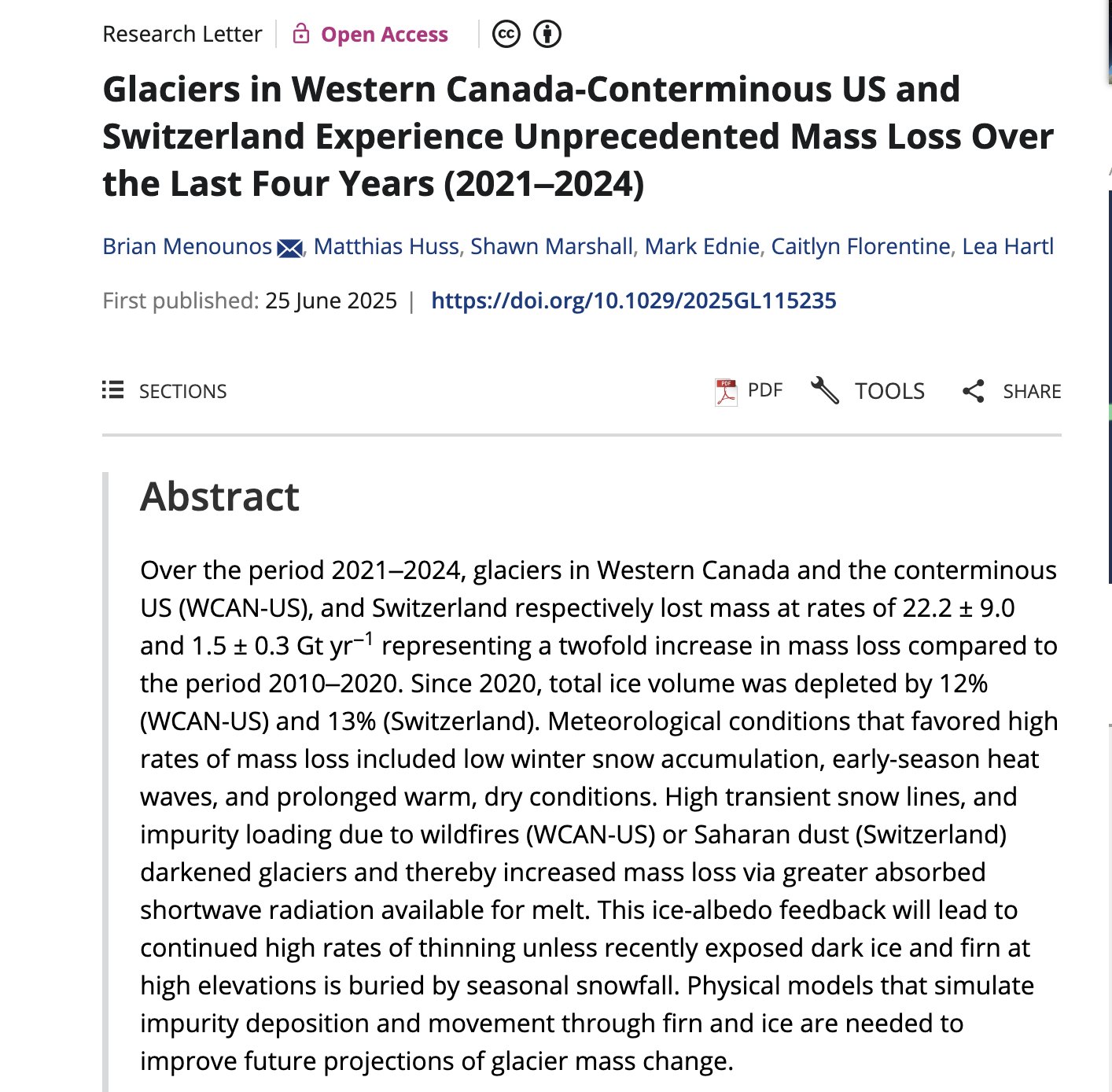 Menounos, B., Huss, M., Marshall, S., Ednie, M., Florentine, C., & Hartl, L. (2025). Glaciers in Western Canada-conterminous US and Switzerland experience unprecedented mass loss over the last four years (2021–2024). Geophysical Research Letters, 52, e2025GL115235. https://doi.org/10.1029/2025GL115235